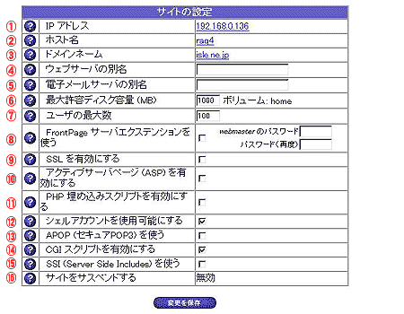 最大許容ディスク容量は、そのサイトに割り当てるHDDの容量 であり、そのサイトのホーム ディレクトリ以下のすべての領域の容量となります。ドメインのWeb領域、ドメインのユーザ領域、ユーザのWeb領域、アクセスログ、メールなどの領域はすべてこの容量 内で確保されます。 サイトの運用が始まったあとで割り当て容量の変更をすることも可能です。 |
