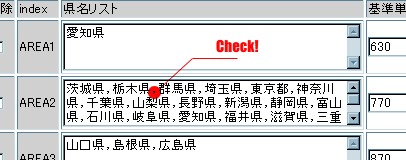 県名リスト、基準単価、課金単価などを入力します。 地域設定の行を増やしたい場合は行の追加ボタンをクリックし、削除したい場合は削除のチェックボックスにチェックを入れ削除ボタンを押すと行を削除できます。 「削除」チェックされている行と、県名リストと基準単価がブランクの行は削除されます。 複数行の削除が可能です。編集が終わりましたら「更新」ボタンを押して下さい。