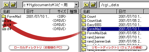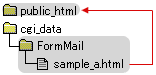 先程確認した「sample_a.html」は、左の図のように「FormMail」ディレクトリごと、「public_html」の中に移し替えてあげなくてはなりません。 |