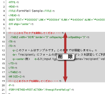 これらはフォームメールにとっては不要なタグなので、全て削除してください。 |